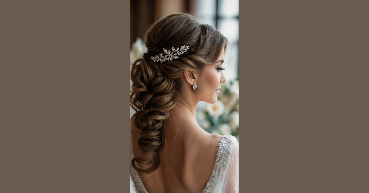 And can we just appreciate the sparkle? That gorgeous leaf-like hairpiece isn’t just sitting there; it’s practically throwing a glitter party in her hair, making sure everyone knows who the star of the show is. Paired with those equally blingy earrings, she’s basically glowing from every angle. This isn’t just a hairstyle; it’s a whole mood that screams ‘I’m ready for my happily ever after!’ It proves that when it comes to top wedding hairstyles, sometimes a little sparkle and a lot of elegant curls are all you need to look absolutely unforgettable (and maybe slightly overshadow the cake!).