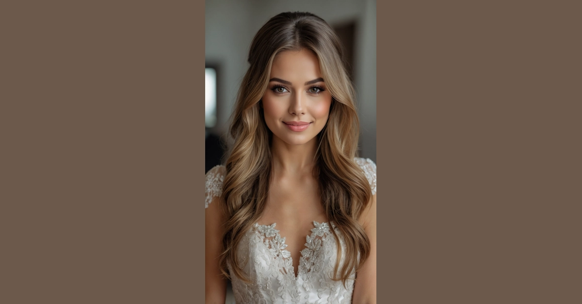 Seriously, with those perfectly flowing locks cascading down her shoulders and that stunning lace dress, she’s absolutely radiating joy. Her half-up, half-down style is the perfect balance of elegant and effortlessly cool, making you forget all about trying to tame every single strand. This look says, “Yes, it’s my wedding day, and my hair is here to celebrate too!” It’s a fun, fresh take that proves sometimes the most beautiful style is the one that lets your natural gorgeousness shine through.